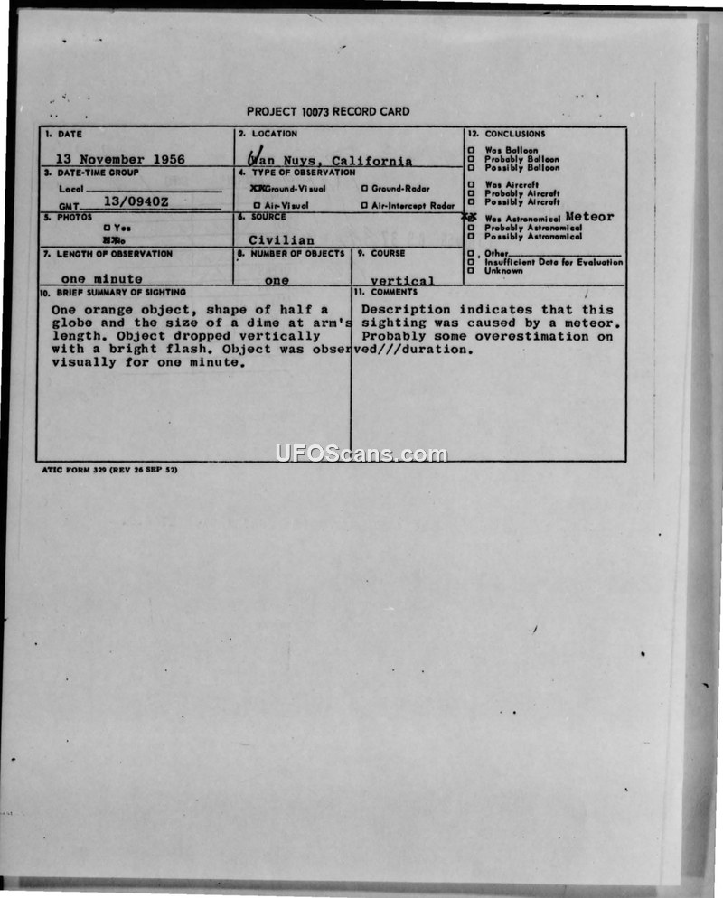 Project 10073 Record Card — Van Nuys, California, 13 November 1956