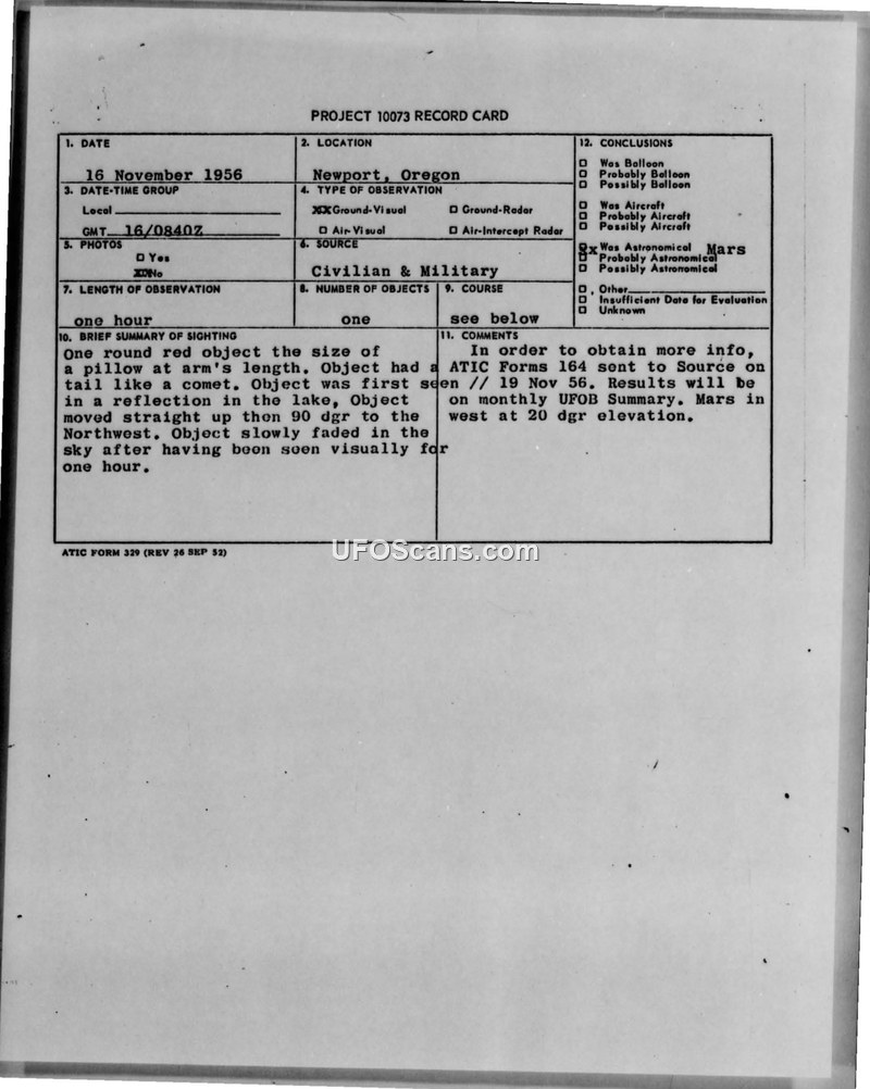 On 16 November 1956, at 0840Z, a sighting of an unidentified aerial object was reported near Newport, Oregon. The witness, identified as CMB Boyer of the USCG Hecta Head Florence station, observed a single, round, red object that appeared to be the size of a pillow at arm's length. The object was described as having a tail similar to a comet. The witness first observed the object as a reflection in a lake. The object reportedly moved straight up and then turned 90 degrees toward the Northwest, eventually fading in the sky after being observed for one hour. The observation was conducted visually, with the aid of field glasses. The incident was reported through military channels, specifically the 25th Air Division at McChord AFB, to the Air Technical Intelligence Center (ATIC). Following the report, ATIC initiated further investigation by sending ATIC Forms 164 to the source on 19 November 1956. The official conclusion reached by the evaluating agency was that the object was the planet Mars, which was positioned in the west at a 20-degree elevation at the time of the sighting. The findings were slated for inclusion in the monthly UFOB Summary.