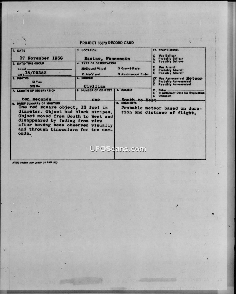 A 14-year-old witness in Racine, Wisconsin, reported a red, square object with black stripes on November 17, 1956. The Air Technical Intelligence Center concluded the object was a probable meteor.