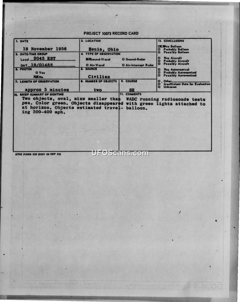 A 16-year-old witness reported two green, oval objects in Xenia, Ohio, on 18 November 1956. The Air Force concluded the objects were radiosonde balloons with lights attached, launched by WADC.
