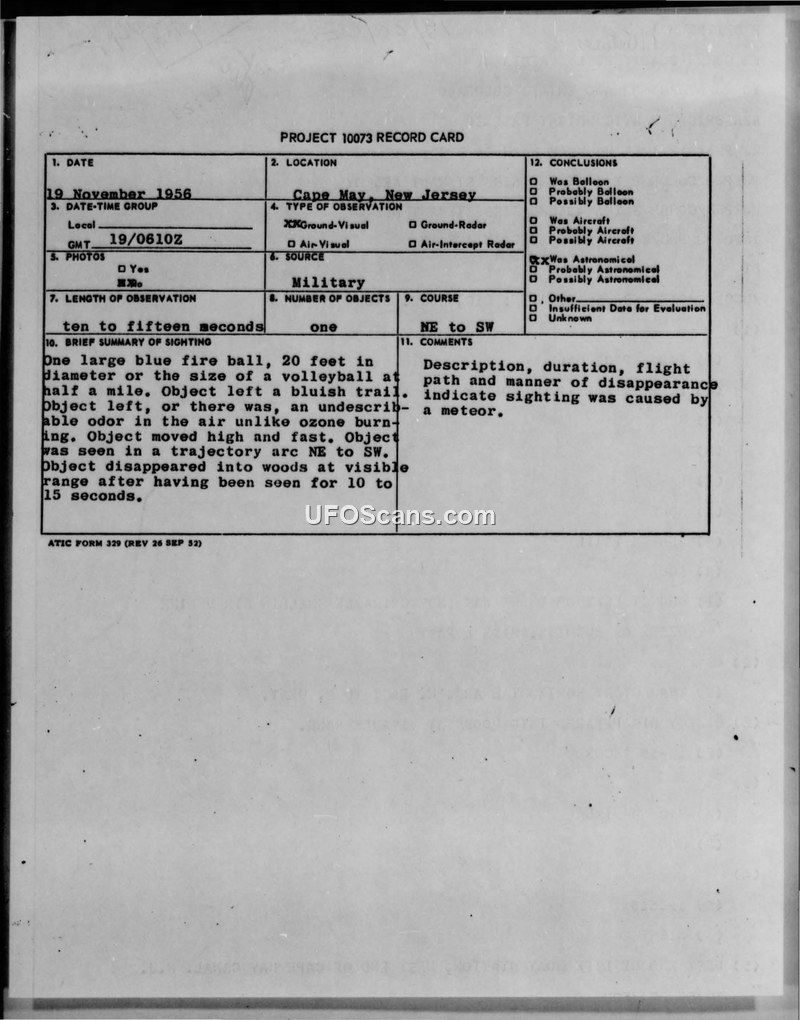 On 19 November 1956, at 0610Z, a U.S. Coast Guard seaman stationed at the west end of the Cape May Canal in New Jersey observed an unidentified aerial phenomenon. The witness, described as a reliable individual by the officer of the day, reported seeing a large blue fireball, estimated to be 20 feet in diameter or the size of a volleyball when viewed from a distance of half a mile. The object traveled in a high, fast trajectory arc from the northeast to the southwest, leaving behind a bluish trail. Notably, the witness reported an indescribable odor in the air, which was explicitly noted as being unlike ozone or burning. The observation lasted between 10 and 15 seconds before the object disappeared into the woods at visible range. The incident was documented on a Project 10073 record card and reported via teletype (NBR 5244) to various Air Force intelligence commands, including the Air Technical Intelligence Center (ATIC). Meteorological data for the time of the sighting indicated clear skies with 15-mile visibility. Following an evaluation of the report, the official conclusion reached by Major F. H. Willcox of the USAF was that the sighting was caused by a meteor. The report explicitly notes that there were no aircraft in the locality and no inversion phenomena present, further suggesting the possibility of a shooting star or comet.