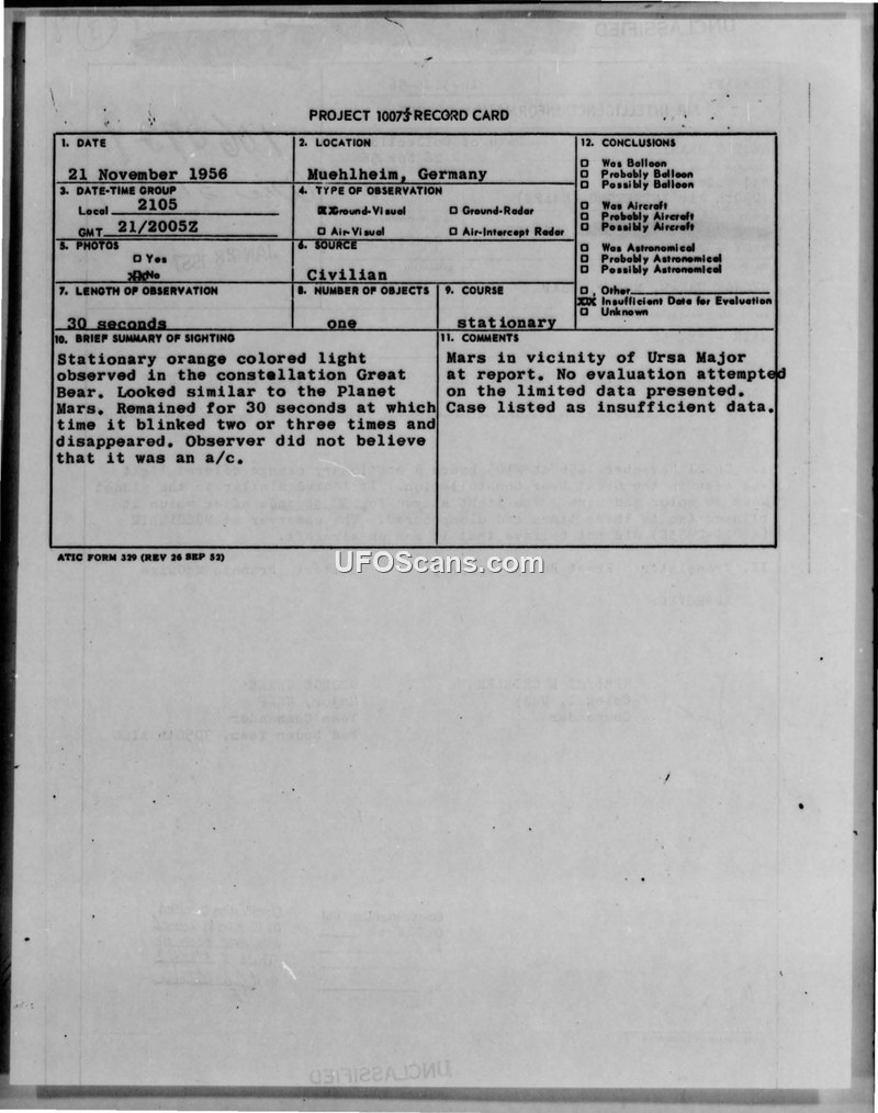 A civilian in Muehlheim, Germany, reported a stationary orange light in the Great Bear constellation on 21 November 1956. The military investigation concluded there was insufficient data to evaluate the sighting, noting the presence of Mars in the vicinity.
