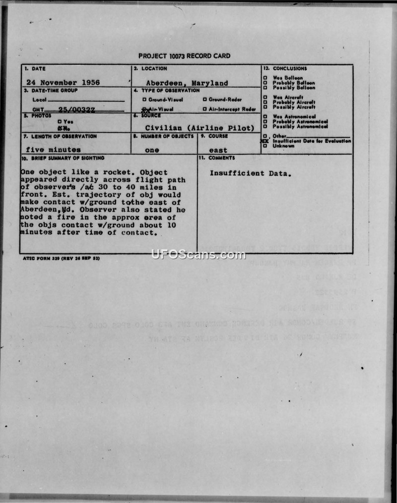 An airline pilot reported a rocket-like object crossing his flight path near Aberdeen, Maryland, on November 24, 1956. The pilot also observed a fire on the ground in the vicinity of the object's trajectory shortly thereafter, but the official investigation concluded there was insufficient data.