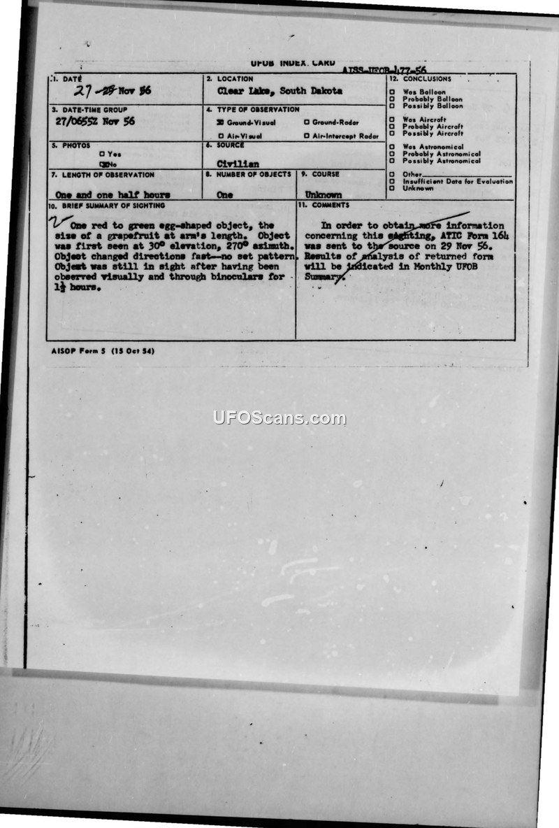 This document is a UFOB Index Card (reference number ATSS-UFOB-177-56) detailing a sighting that occurred between November 27 and November 29, 1956, in Clear Lake, South Dakota. The report describes a single, egg-shaped object that appeared red to green in color. The witness estimated the object's size to be equivalent to a grapefruit held at arm's length. The object was first observed at an elevation of 30 degrees and an azimuth of 270 degrees. According to the report, the object moved rapidly and erratically with no set pattern. The total duration of the observation was one and one-half hours, during which the witness used binoculars to track the object. The report indicates that the source was civilian and that no photographic evidence was obtained. No radar contact was reported. The document notes that ATIC Form 164 was sent to the source on November 29, 1956, to gather further information, and that the results of that analysis would be included in a future Monthly UFOB Summary.