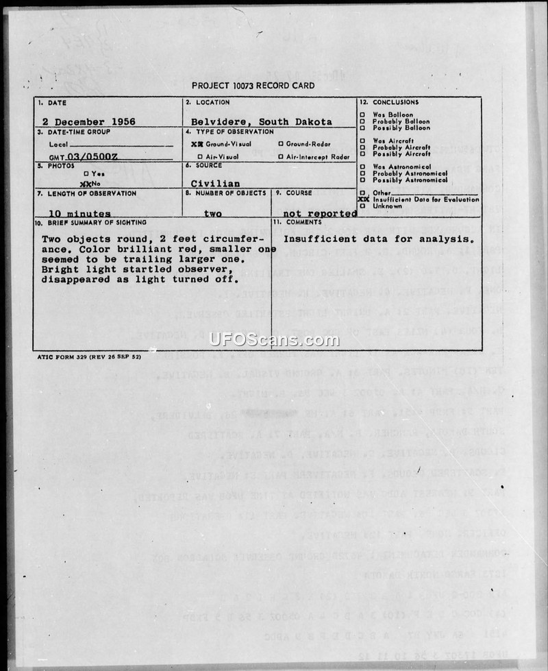 On December 2, 1956, at approximately 0500Z, a civilian rancher near Belvidere, South Dakota, reported observing two unidentified objects. The witness described the objects as round, approximately two feet in circumference, and brilliant red in color. The smaller of the two objects appeared to be trailing the larger one. The observer reported being startled by a bright light associated with the objects, which subsequently disappeared as if the light had been turned off. The duration of the observation was estimated at ten minutes. The report was filed in accordance with Air Force Regulation 200-2 and processed by the Air Technical Intelligence Center. The official conclusion reached by the evaluating agency was that there was insufficient data available to conduct a formal analysis of the event. Weather conditions at the time were noted as having scattered clouds. No radar contact was made, and no photographic evidence was obtained.