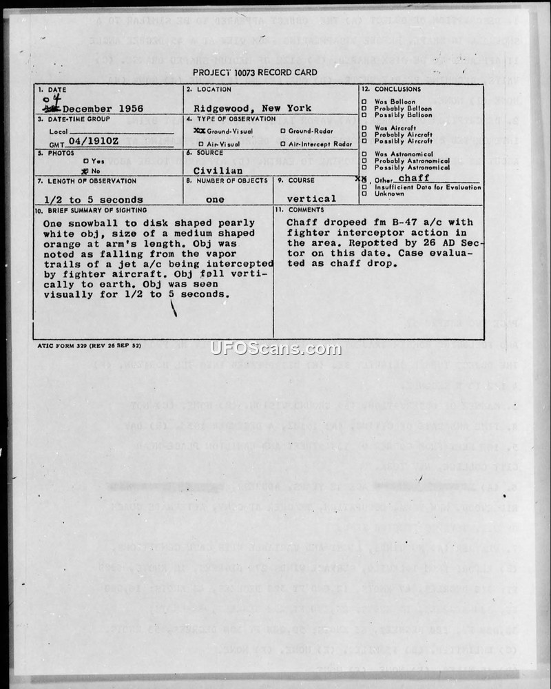 A sighting of a pearly white object in Ridgewood, New York, on December 4, 1956, was investigated and officially identified as chaff dropped from a B-47 aircraft during military interceptor exercises.