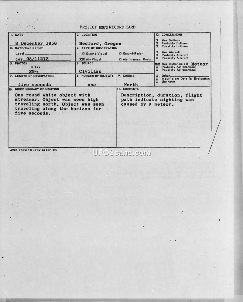 A 1956 sighting report from Medford, Oregon, describes a round, white object with a streamer. The Air Technical Intelligence Center concluded the object was a meteor.