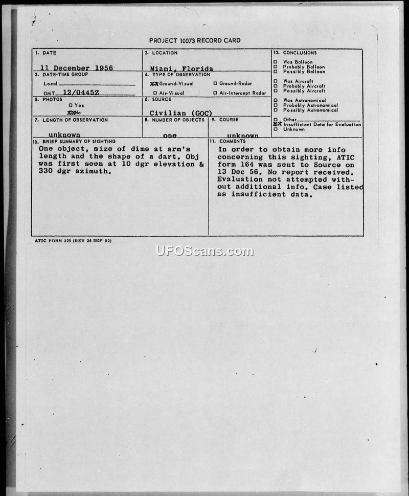 This document contains two Project 10073 record cards and associated teletype communications regarding unidentified aerial phenomena reported in Miami, Florida, in December 1956. The first incident, occurring on 11 December 1956, involved a single object described as having the shape of a dart, with a red nose, yellow body, and green tail, appearing the size of a dime at arm's length. It was observed at a 10-degree elevation and 330-degree azimuth. An ATIC form 164 was sent to the source to gather more information, but no report was received, leading to the case being closed as having insufficient data for evaluation. The second incident occurred on 18 December 1956 and involved a single red and green blinking light. The witness, a student at the University of Miami, reported that the object was initially stationary in the south before suddenly veering to the south-southwest at a very high rate of speed. This observation lasted for five minutes and was made both visually and through binoculars. The reporting officer concluded that this sighting was likely caused by an aircraft. Notably, the documentation includes a remark that a Duty Director named Sheepman instructed that the 18 December report be disregarded. The documents reflect the standard military procedure for processing civilian reports through the Ground Observer Corps (GOC) filter centers and the subsequent evaluation by the Air Technical Intelligence Center.