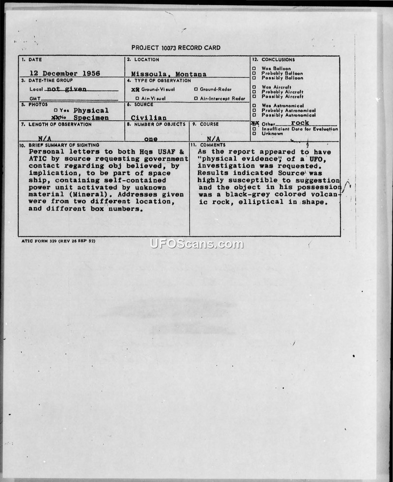 An investigation into a reported UFO fragment in Montana concluded the object was a common volcanic rock. The individual who claimed to possess the object was deemed highly susceptible to suggestion.