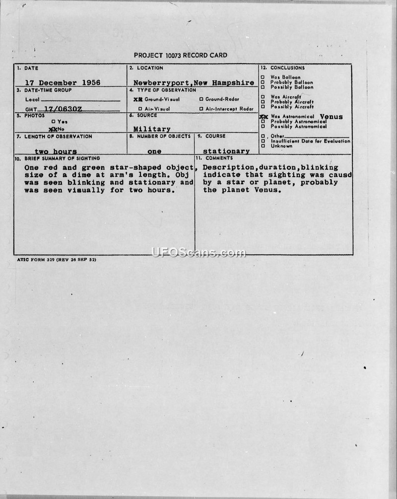 A 1956 U.S. Coast Guard sighting of a stationary, blinking, red and green object in New Hampshire was officially identified by ATIC as the planet Venus.