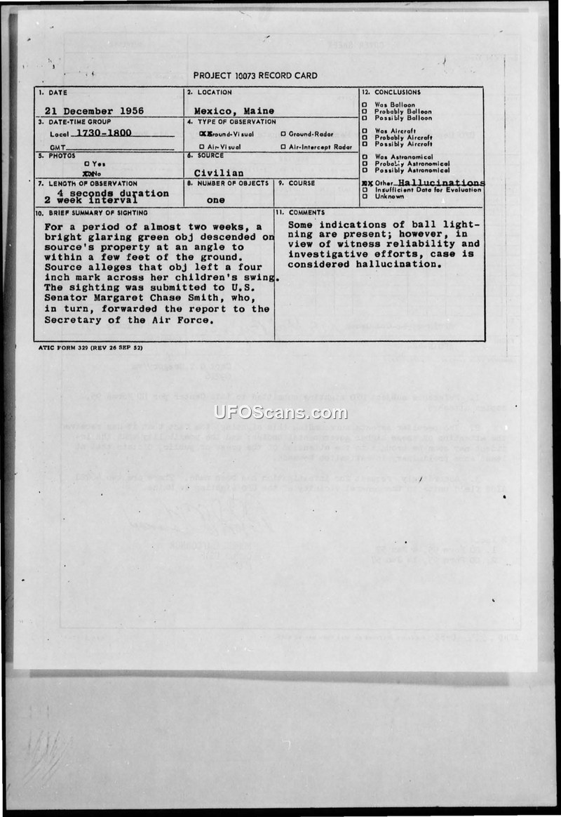 Project 10073 Record Card — Mexico, Maine, 21 December 1956