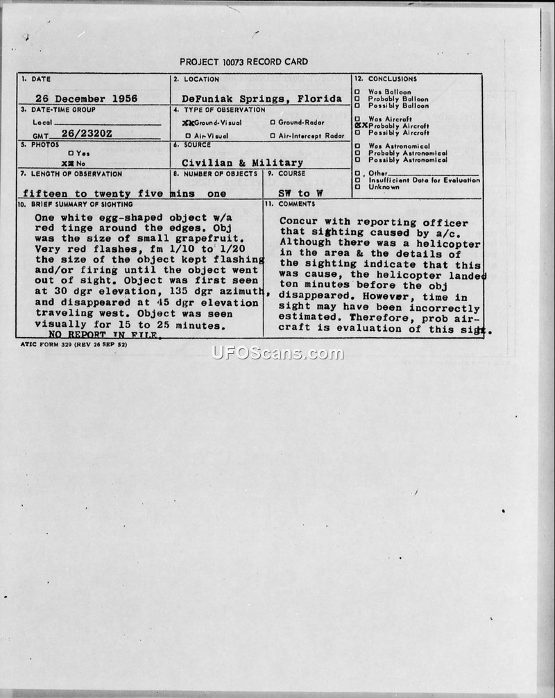 PROJECT 10073 RECORD CARD — DeFuniak Springs, Florida, 26 December 1956
