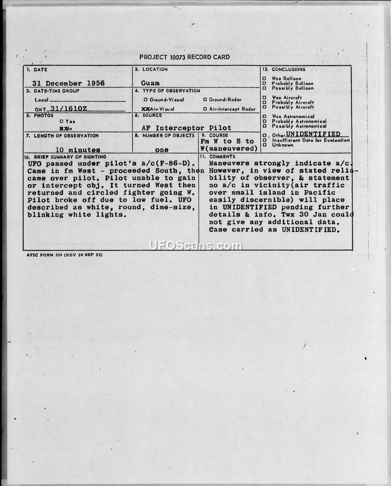 An Air Force pilot reported a 10-minute encounter with an unidentified object over Guam on December 31, 1956. Despite maneuvers suggesting an aircraft, the case remained classified as unidentified due to a lack of corroborating air traffic.