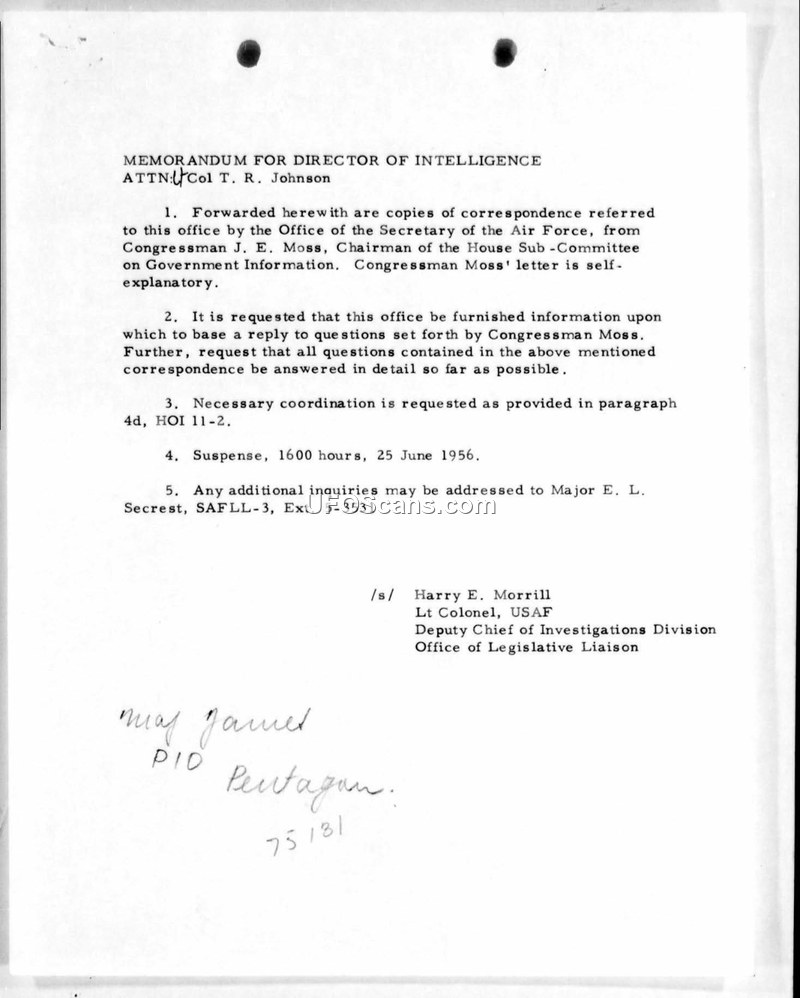 This document collection details an inquiry from Congressman John E. Moss, Chairman of the House Sub-Committee on Government Information, to the Secretary of the Air Force, Donald A. Quarles, regarding the public availability of 'United States Air Force Project Blue Book, Special Report No. 14.' The Sub-Committee had received complaints that the report, while unclassified, was difficult for the public to access, requiring a personal visit to the Pentagon. Congressman Moss requested information on the number of copies printed, the number of requests received, and the justification for any restrictions on public access. The Air Force response, prepared by the Office of Legislative Liaison and the Air Technical Intelligence Center (ATIC), explains that only 100 copies of the full report were printed due to the high cost of production, estimated at $10 to $15 per copy. The Air Force argued that it was not withholding information but was instead directing the public to a summary and press release to manage costs. The correspondence notes that ATIC received eight inquiries for the report, while the Department of Defense Office of Public Information received between 300 and 350 requests for information, primarily from students. The Air Force maintained that it had made a 'very definite effort' to make the information available through reasonable means, including providing copies on loan for reproduction in cases of obvious need.
