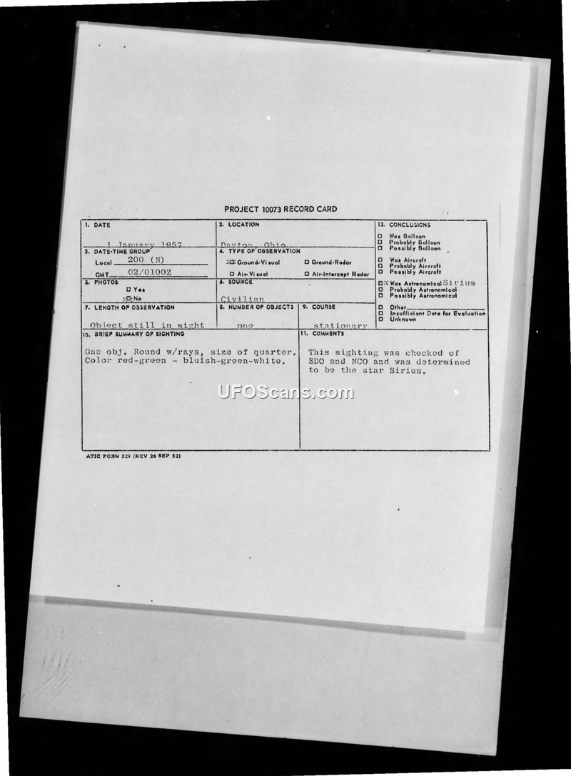 This document contains Project 10073 record cards and a disposition form detailing two separate UFO sightings reported in Dayton, Ohio, in January 1957. The first report, dated January 1, 1957, describes a stationary object with rays, appearing in colors of red, green, and white. The witness, a civilian, compared the object's appearance to a pin-point of light or someone using an arc welder at a distance. After investigation by the Staff Duty Officer (SDO) and Non-Commissioned Officer (NCO), the object was officially identified as the star Sirius. The second report, dated January 7, 1957, involves a UFO observed moving westward toward the moon. This report was relayed to the Air Technical Intelligence Center (ATIC) by the Dayton Civil Defense Headquarters. Upon receiving the report, the SDO contacted RAPCON (Radar Approach Control) to check for radar contacts. The radar check revealed no unidentified objects in the vicinity; the only object detected within a 40-mile radius was an aircraft proceeding westward on the Victor 47 airway. The disposition form, signed by Major J.J. Connair, Jr., confirms that the January 7 sighting was investigated and attributed to an aircraft. The documentation includes a technical information sheet filled out by the witness of the January 1 sighting, providing details on the observation conditions, the witness's location, and their subjective impressions of the object's behavior.