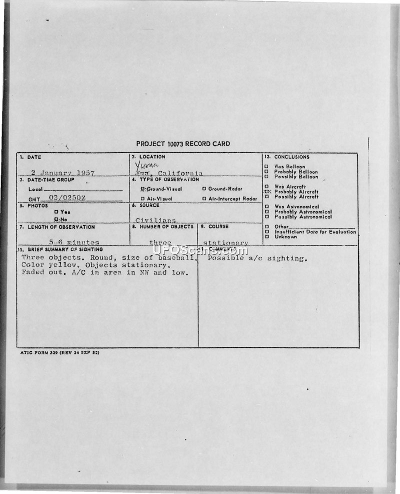 A 1957 sighting report from Yuma, California, involving three stationary, round, yellow objects observed by civilians. The official conclusion categorized the event as 'Probably Aircraft'.