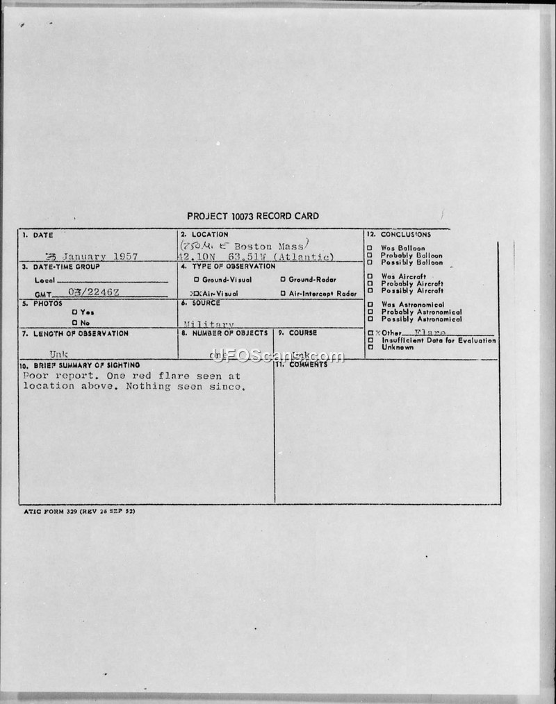 A report of a single red flare sighted 250 miles east of Boston on January 3, 1957. The military dismissed the incident as a flare, noting it was not a UFO-related matter.