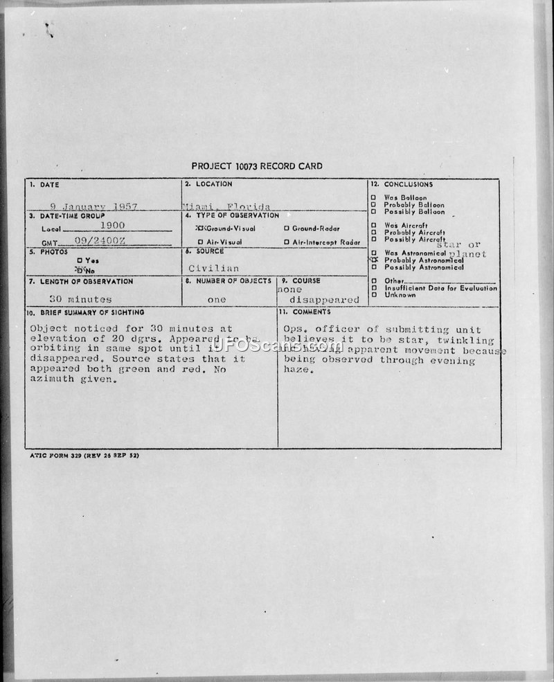 Project 10073 Record Card — Miami, Florida, 9 January 1957