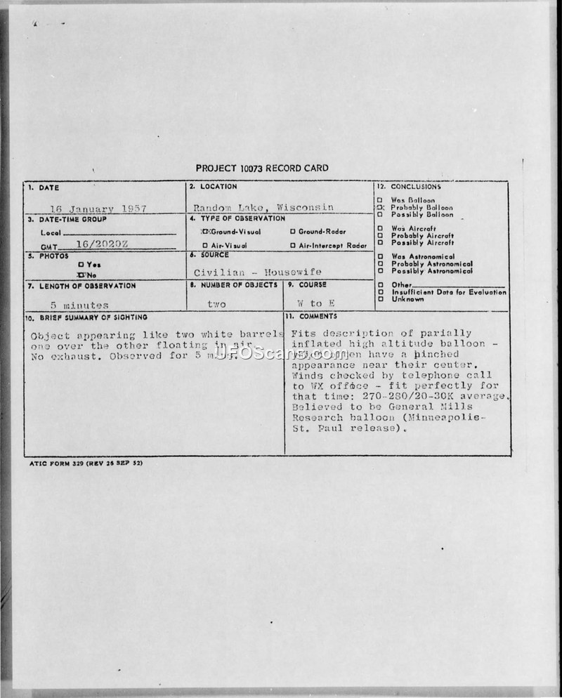Project 10073 Record Card — Random Lake, Wisconsin, 16 January 1957