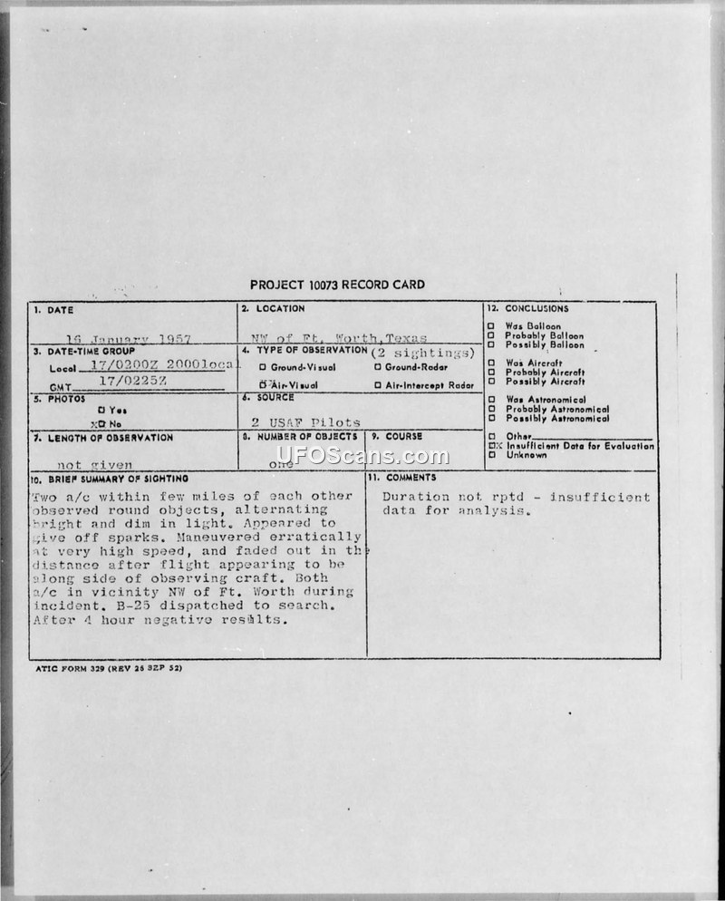 Project 10073 Record Card — 16 January 1957, NW of Ft. Worth, Texas