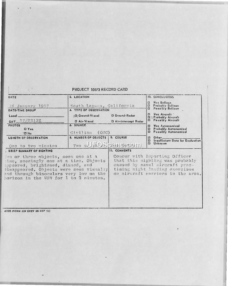 This document consists of a Project 10073 record card and associated teletype correspondence regarding a UFO sighting that occurred on 16 January 1957 in South Laguna, California. The report details an observation of two or three objects, seen one at a time, which appeared, brightened, dimmed, and eventually disappeared. The witnesses, identified as civilians associated with the Ground Observer Corps (GOC), observed the phenomena through binoculars for a duration of one to two minutes. The objects were described as being very low on the horizon in the west-southwest direction. The official conclusion reached by the Air Technical Intelligence Center (ATIC) was that the sighting was likely caused by naval aircraft conducting night landing exercises on aircraft carriers in the vicinity. This conclusion was reached after consultation with the Civil Aeronautics Administration (CAA) and Naval Intelligence, although neither agency could definitively confirm the presence of specific aircraft at the exact time of the sighting. The documentation includes internal notes from the reporting officer, Harold J. Schmidt, Jr., and reflects the standard investigative process for UAP reports during this period, emphasizing the attempt to correlate sightings with known military or astronomical activity.