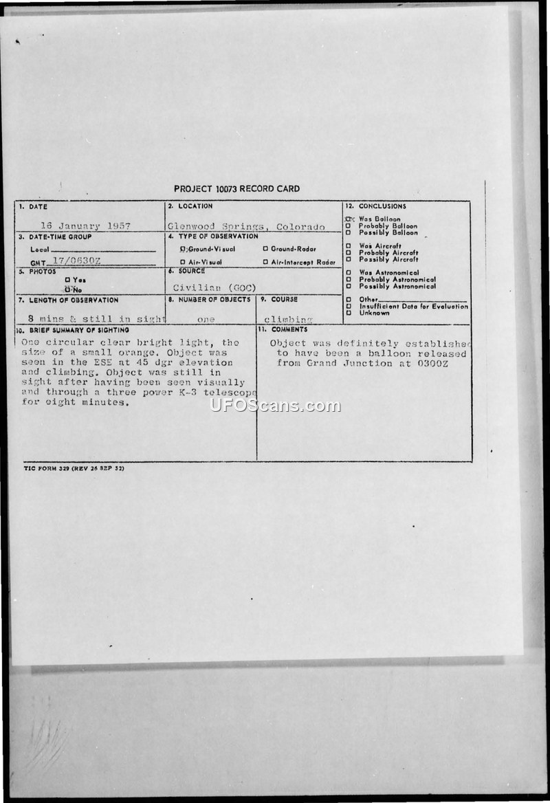 A civilian reported a bright, circular object in Glenwood Springs, Colorado, on January 16, 1957. The USAF investigation concluded the object was a weather balloon released from Grand Junction.
