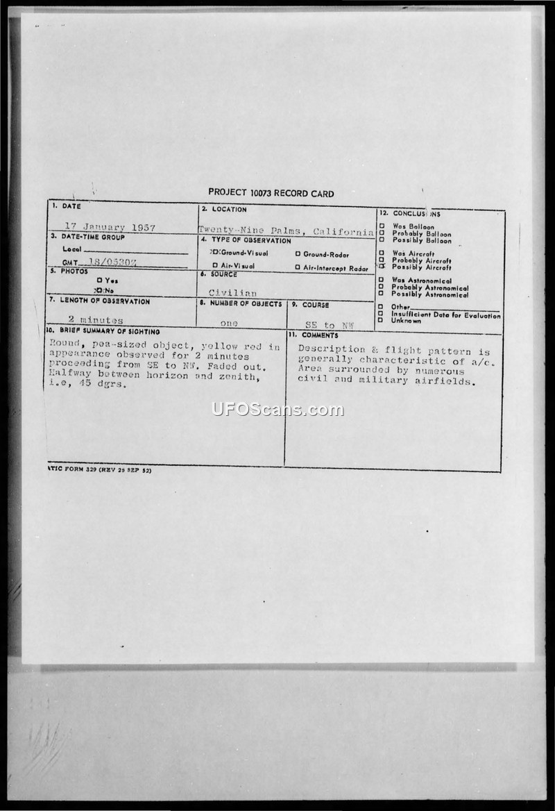 A civilian sighting of a yellow-red, round object in Twenty-Nine Palms, California, on January 17, 1957. The investigation concluded the object was likely an aircraft due to local flight patterns and proximity to airfields.