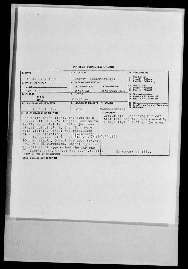 Project 10073 Record Card — Liberty, Pennsylvania, 19 January 1957