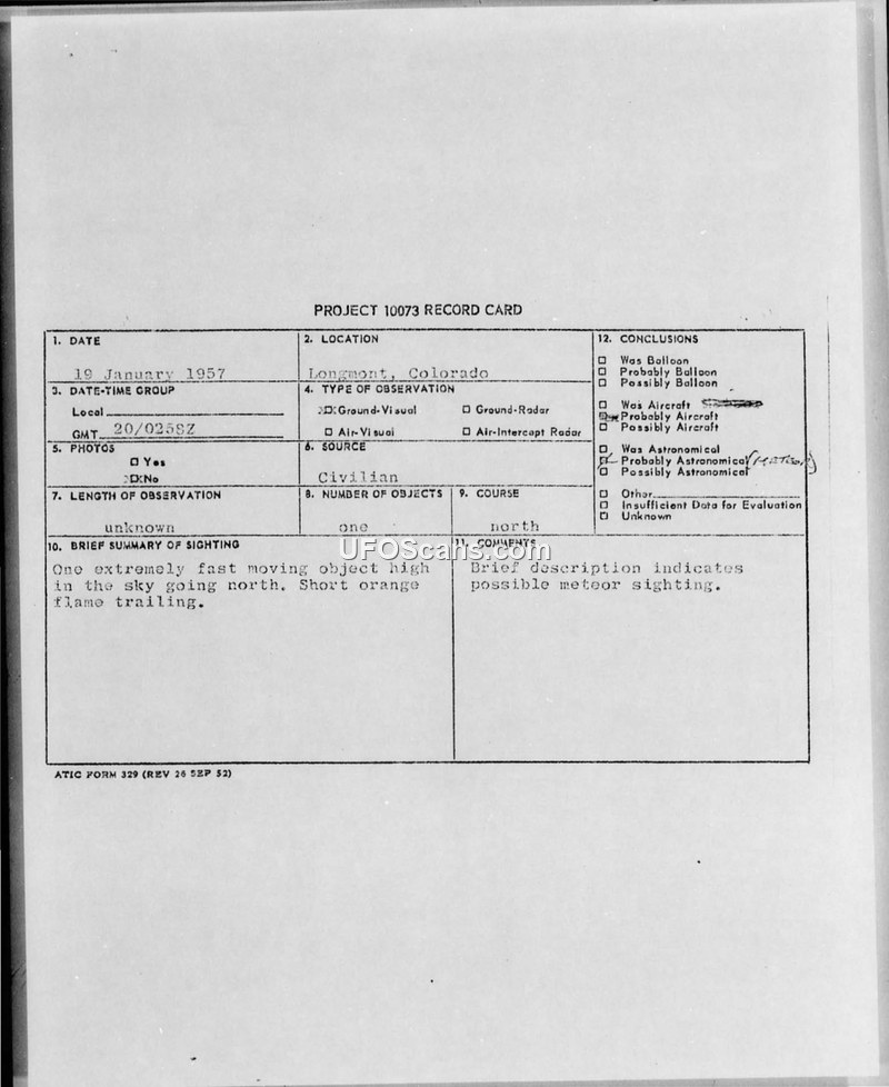 Project 10073 Record Card — Longmont, Colorado, 19 January 1957