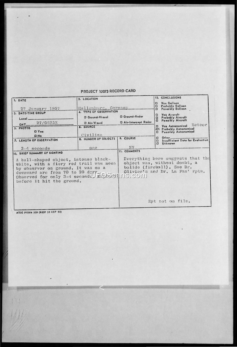 Project 10073 Record Card — Hellenburg, Germany, 27 January 1957