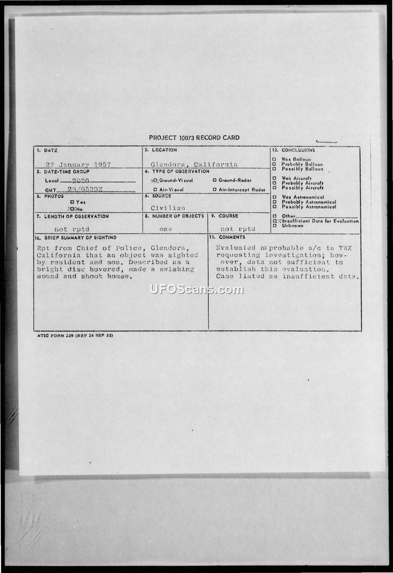 Project 10073 Record Card — Glendora, California, 27 January 1957