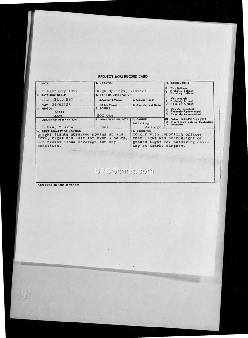 PROJECT 10073 RECORD CARD - High Springs, Florida - 3 February 1957