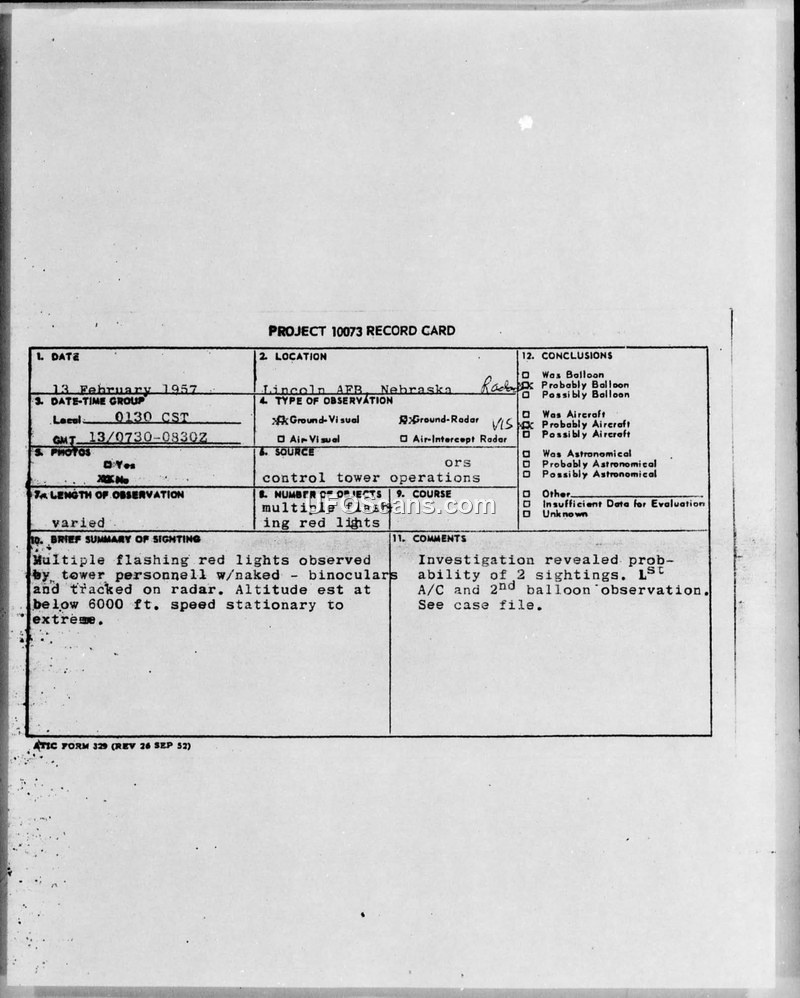 Project 10073 Record Card and Supplement to AF Form 112 — Lincoln AFB, Nebraska, 13 February 1957