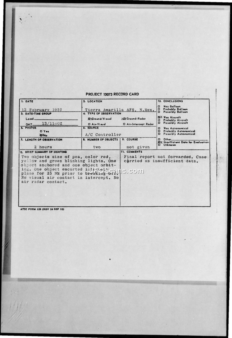 Project 10073 Record Card and Related Correspondence — Tierra Amarilla AFS, 13 February 1957
