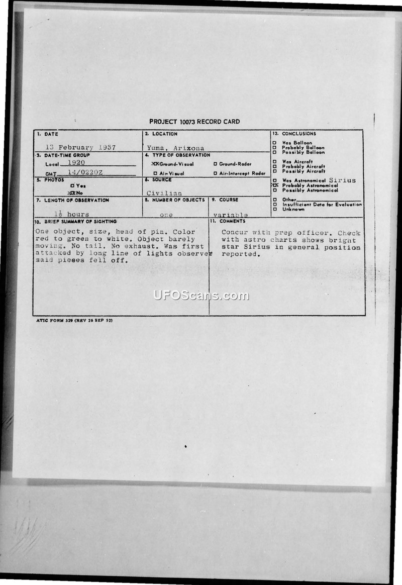 A civilian in Yuma, Arizona, reported a color-changing object in the sky on February 13, 1957. Military investigators concluded the object was the star Sirius.