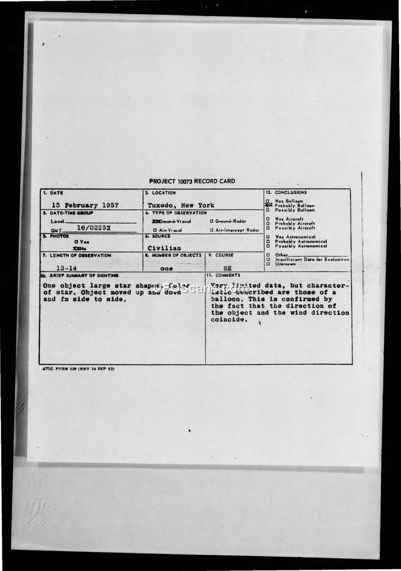 Project 10073 Record Card — Tuxedo, New York, 15 February 1957