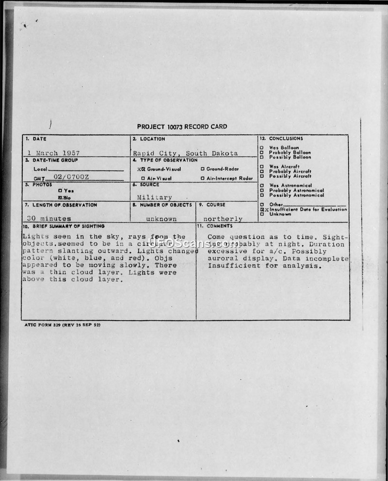 PROJECT 10073 RECORD CARD — Rapid City, South Dakota, 1 March 1957