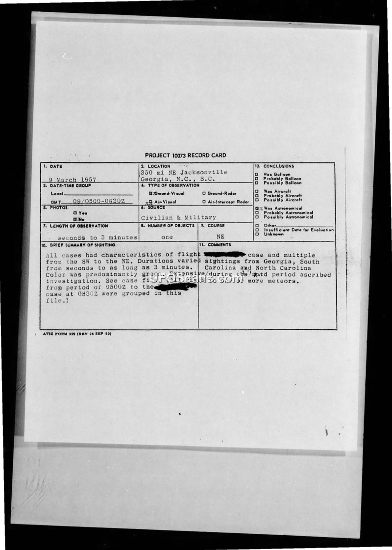 Project 10073 Record Card and Air Intelligence Information Report: PAA Flight 257 Incident, 9 March 1957