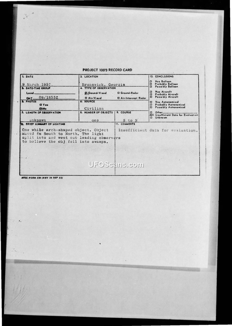 A report of an arch-shaped UFO sighting in Brunswick, Georgia, on March 9, 1957. The investigation concluded there was insufficient data for evaluation.
