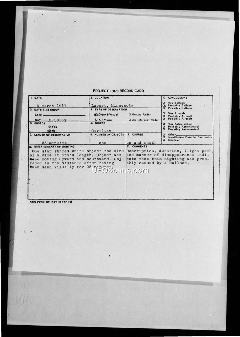 A civilian in Laport, Minnesota, reported a star-shaped object on March 9, 1957. The military investigation concluded the object was likely a balloon.