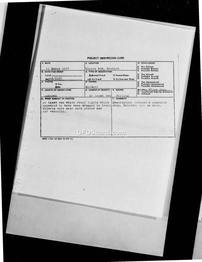 A sighting of two white, round lights near Glynco NAS on March 11, 1957, was investigated by military personnel. The official conclusion attributed the lights to a flare drop, despite no specific mission being confirmed.