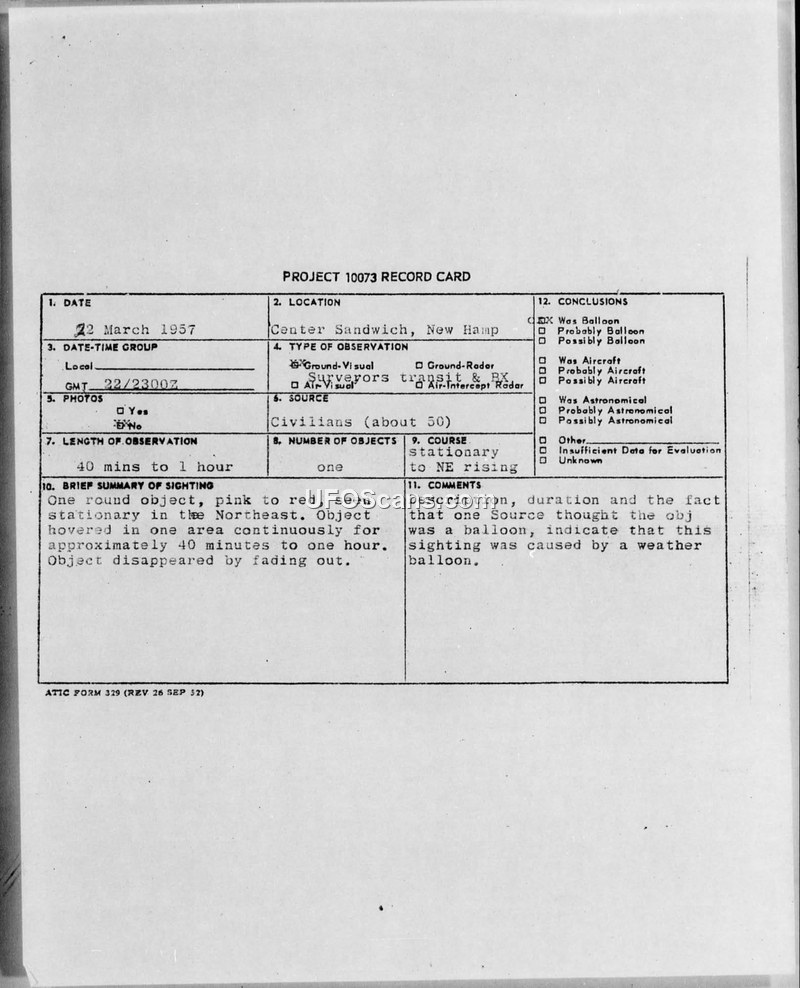 On 22 March 1957, between 2300 and 2400 Zulu, approximately fifty people in Center Sandwich, New Hampshire, observed an unidentified flying object. The object was described as round, pink to red in color, and larger than a B-47 aircraft. It featured three equally spaced illuminating lights and remained stationary in the northeast for approximately 40 minutes to one hour before rising to great heights and disappearing by fading out. One witness, a retired USAF Major and local postmaster, observed the object through a surveyor's transit for approximately 25 minutes, during which time it hovered between 357 and 020 degrees magnetic. While most witnesses had no opinion on the nature of the object, the observer who used the transit concluded it was a balloon. An investigation team from the 100th Bombardment Wing, including Captain Paul J. Anthony, arrived in Center Sandwich on 23 March 1957 to interview witnesses. Although four photographs were reportedly taken of the object, the film was found to be completely blank when developed by the Photo Lab at Portsmouth Air Force Base. The official conclusion reached by the investigating officer was that the sighting was caused by a weather balloon, citing the object's description, duration, and the assessment of the witness who used the transit. No unusual or strange objects were visible in the sky during the period the team investigated the incident.