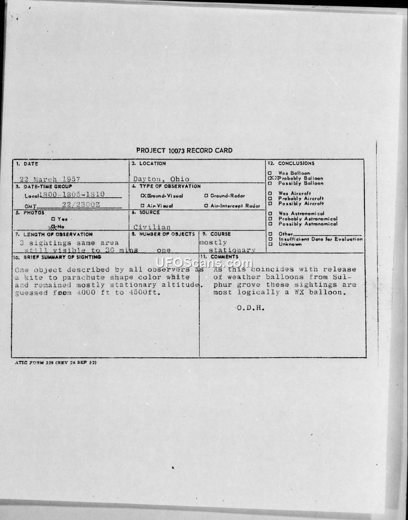 Project 10073 Record Card — Dayton, Ohio, 22 March 1957