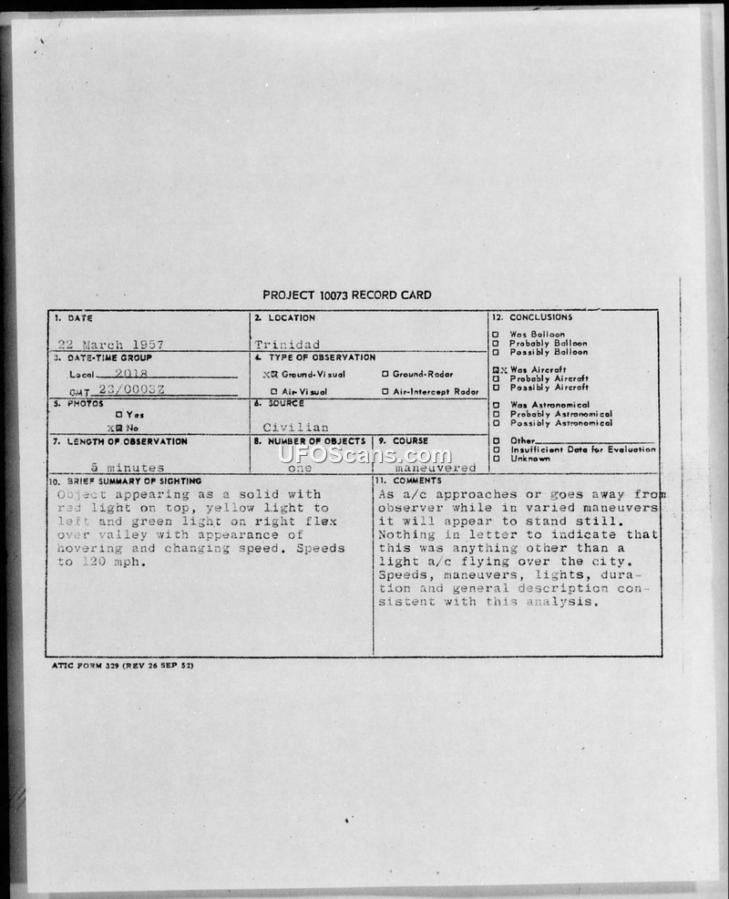 Project 10073 Record Card — Trinidad, 22 March 1957