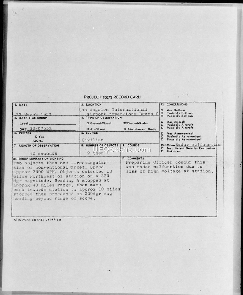 Project 10073 Record Card: Los Angeles International Airport Sighting, 22 March 1957