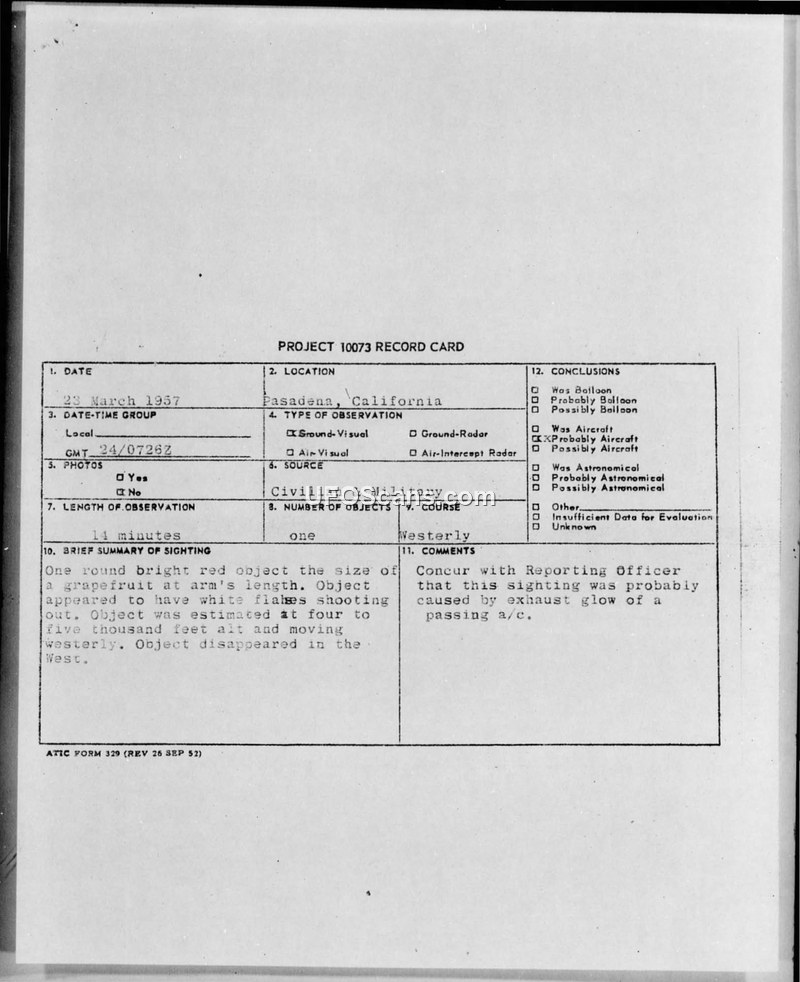 Project 10073 Record Card — Pasadena, California, 24 March 1957