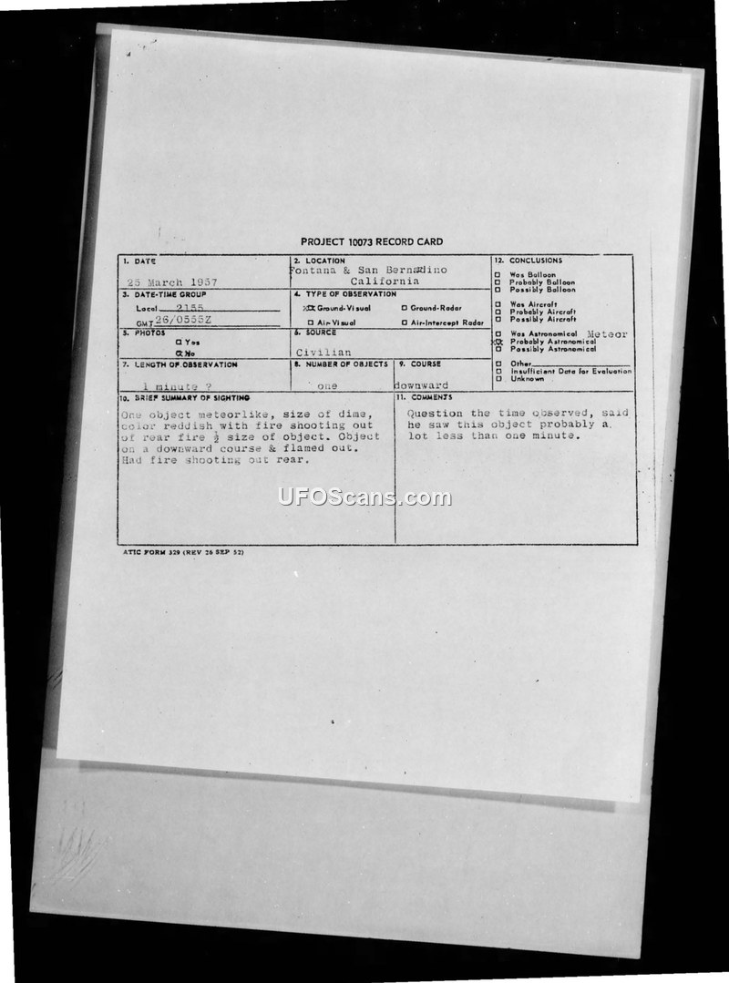 PROJECT 10073 RECORD CARD - FONTANA & SAN BERNARDINO, CALIFORNIA - 25 MARCH 1957