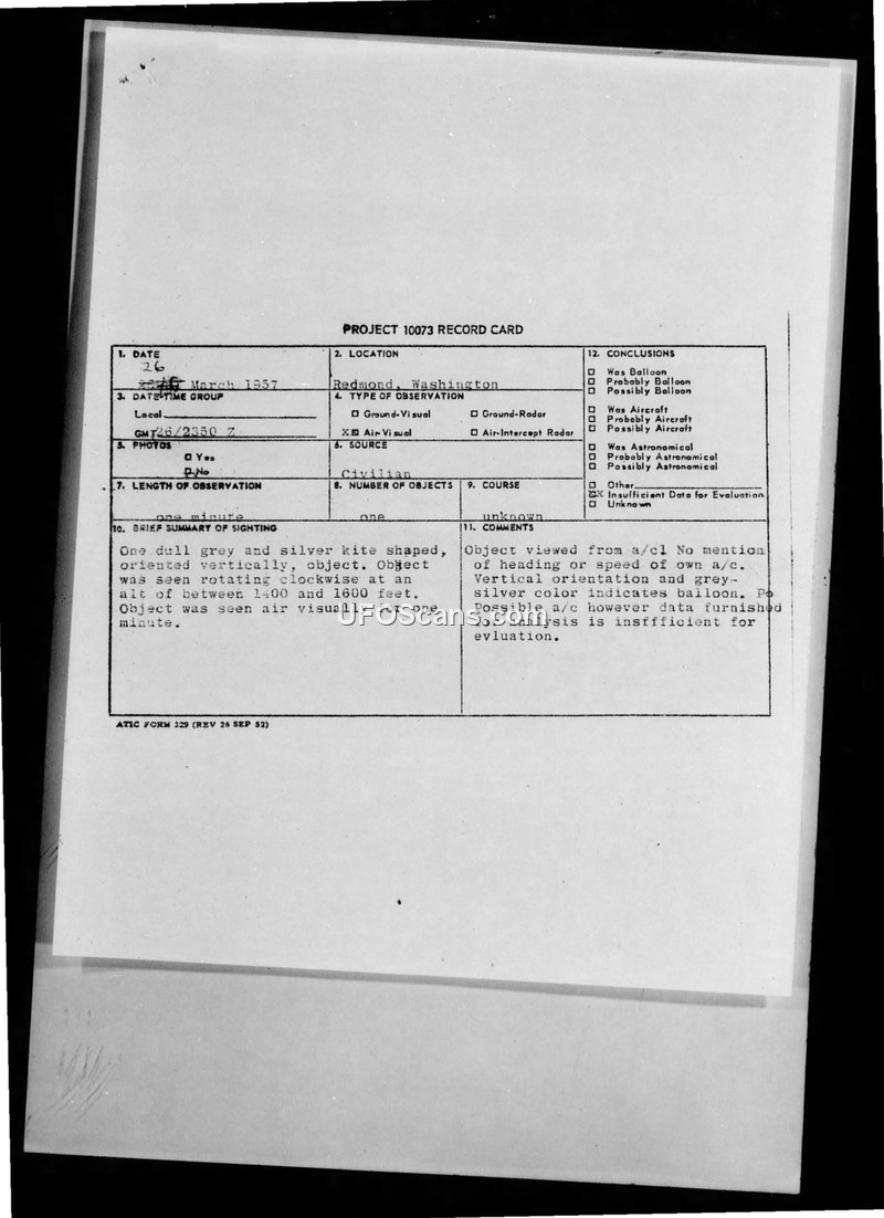 A kite-shaped, rotating object was sighted near Redmond, Washington, on March 26, 1957. Military authorities concluded there was insufficient data to identify the object, despite noting characteristics that could suggest a balloon.