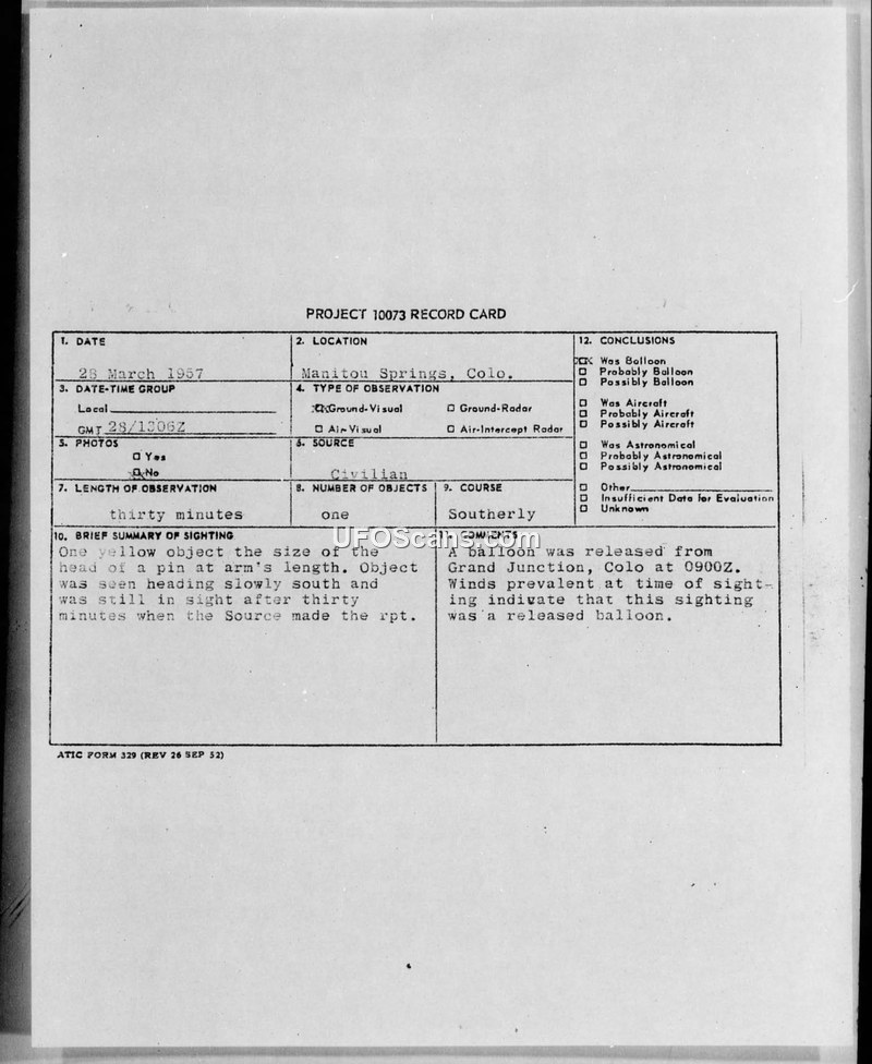 A civilian reported a yellow object in Manitou Springs, Colorado, on 28 March 1957. Military investigation identified the object as a weather balloon released from Grand Junction, Colorado.