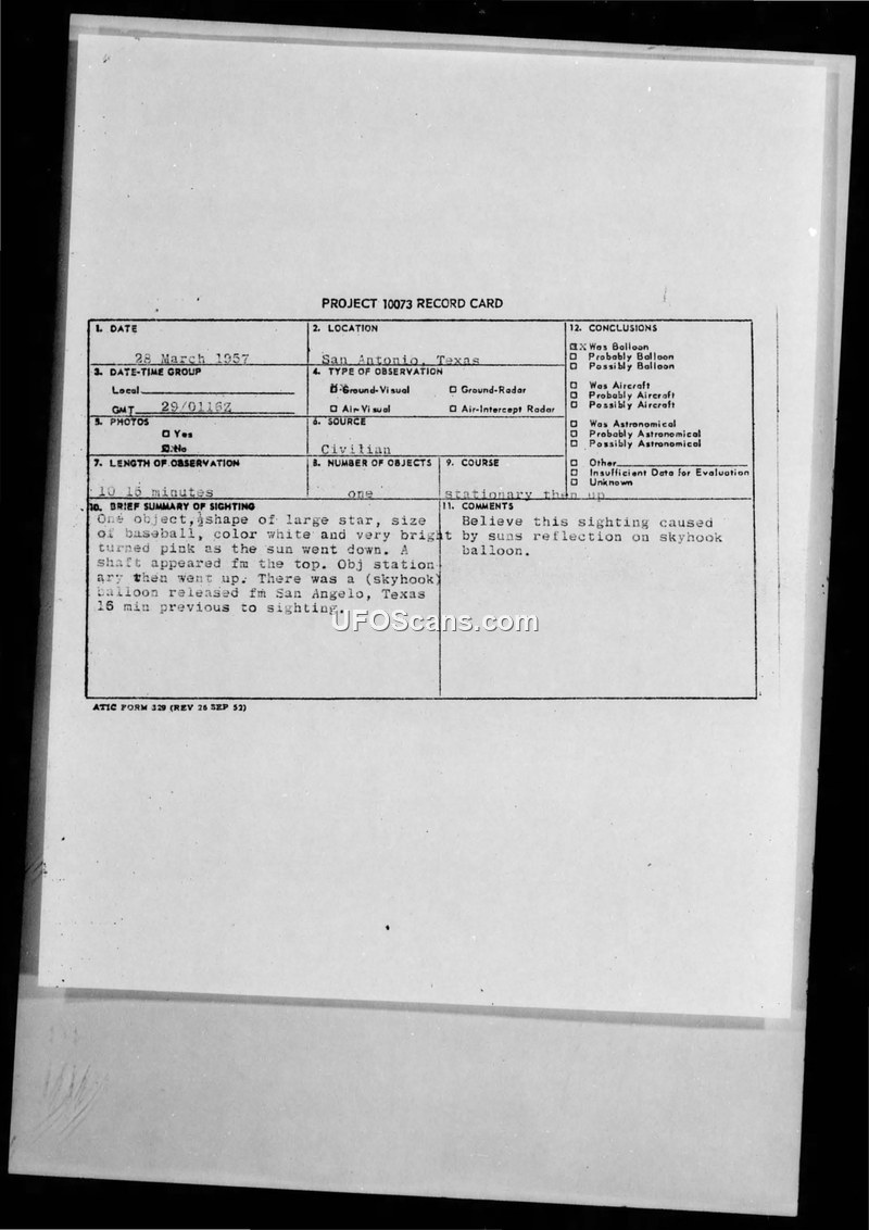 Project 10073 Record Card: Sighting Report - San Antonio, Texas, 28 March 1957